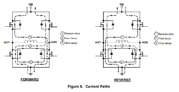 输入也可用于PWM控制,例如,直流电机的速度。当用PWM控制绕组时,当驱动电流中断时,电机的感应特性要求电流必须继续流动。这称为再循环电流。为了处理这种再循环电流,Hbridge可以在两种不同的状态下工作,快衰减或慢衰减。在快速衰减模式下,H桥被禁用,再循环电流流过车身二极管;在慢衰减模式下,电机绕组短路。