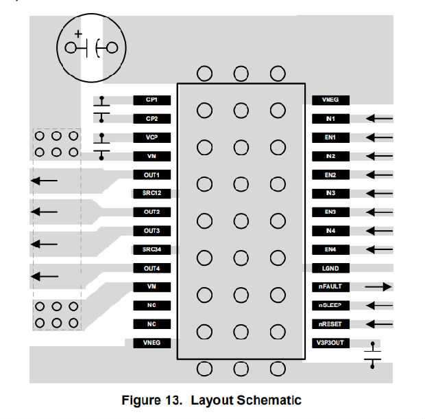 输出可以并联以增加驱动电流。如果像在全桥配置中那样连接输出,任何两个输出都可以并联连接。如果配置为两个独立的半桥,OUT1和OUT2必须成对,OUT3和OUT4必须成对。这种配对是因为引脚6(SRC12)是OUT1和OUT2的低端FET的源,引脚9(SRC34)是OUT3和OUT4的低端FET的源。