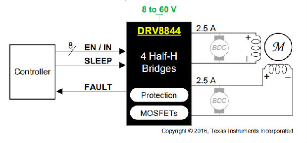 DRV8844可用于驱动一个步进电机、多个有刷直流电机或多个其他感应负载。
