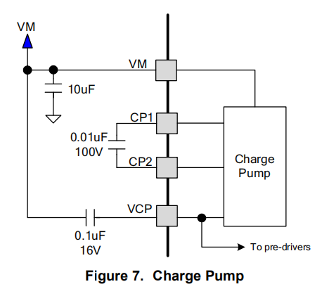 由于输出级使用N沟fet,因此需要一个比VM电源更高的栅极驱动电压来充分增强高侧fet。DRV8844集成了一个电荷泵电路,该电路可产生高于VM电源的电压。