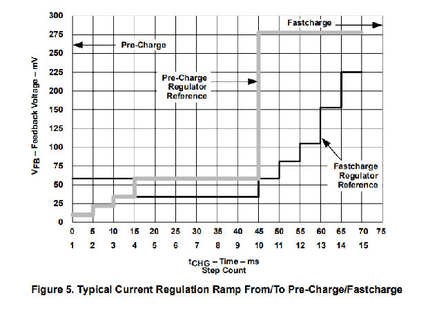 当从预充电过渡到快速充电时,以及进入和退出故障/暂停模式时,两个电流调节回路都会上升和下降,此时LDO需要硬开关。图5展示了典型的步进坡道。