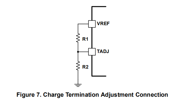 bq24901在电压调节期间监控充电电流。当电流逐渐减小到充电终止电流检测阈值时,设备声明完成条件并终止充电。充电端接电平通过TADJ引脚设置,如表2和图7所示。