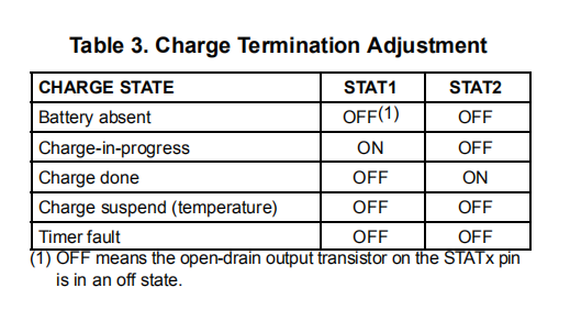 开路漏极STAT1和STAT2输出指示各种充电器操作,如表3所示。