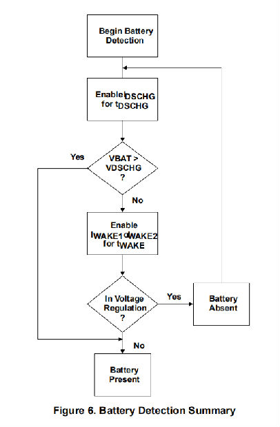 bq24901设计用于可靠地检测电池的插入和移除情况,包括带有开放式保护器的电池组。其他标准功能包括当电池电压低于VRCH阈值时激活的充电功能。