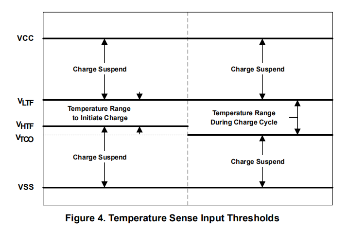 bq24901通过测量TS引脚和Vss之间的电压来持续监测电池温度。负温度系数热敏电阻(NTC)和外部分压器通常会产生此电压。bq24901将此电压与其内部阈值进行比较,以确定充电是否允许。到启动充电循环时,电池温度必须在VLTF至VHTF阈值范围内。如果电池温度超出此范围,设备将暂停充电,并等待电池温度在VLTF至VHTF范围内。在充电周期(预充电和快速充电)期间,蓄电池温度必须在VLTF到VTCO的阈值范围内。如果电池温度超出该范围,bq24901将暂停充电并等待,直到电池温度在VLTF到VHTF的范围内。设备通过关闭CC引脚并保持定时器值(即在暂停状态下计时器不复位)来暂停充电。