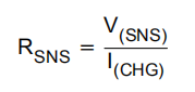 bq24901在电池组电压低于调节电压VREG时提供电流调节。该装置通过与电池组串联的外部感测电阻RSNS的电压降来监控SNS输入端的充电电流。电荷电流反馈,通过引脚SNS应用,维持在VSNS阈值附近的调节。式(1)中的公式计算感测电阻的值。