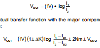 对数符合性定义为与最佳值的峰值偏差拟合VOUT与log(I1/I2)曲线的直线。这是表示为理想满标度输出的百分比。因此用伏特表示的m年非线性误差为:输出电压(NONLIN)=1V/dec•2NmV其中N是日志一致性误差,以百分比表示。单个错误组件电流输入的理想传递函数为: