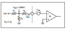 分压器可用于降低电阻,如图4所示。当使用这种方法时必须考虑放大器可能引起的误差输入偏移电压。放大器的输入电压偏移最大值为1.5mV,建议使用VREF a值为100mV。