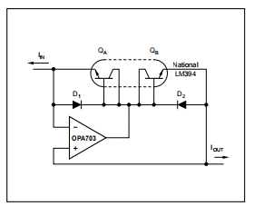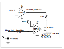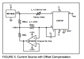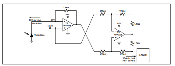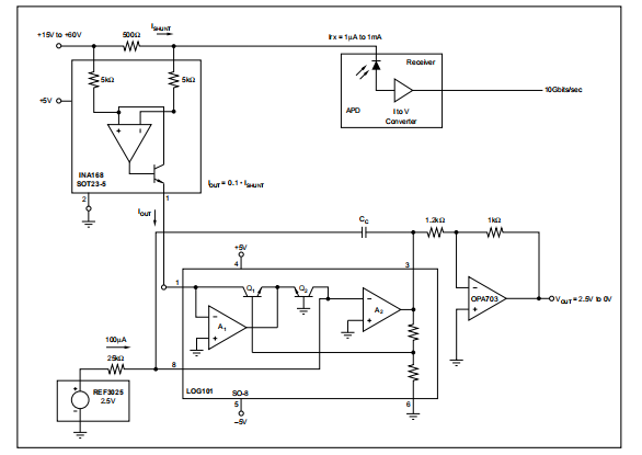 LOG101在电流输入下具有最佳性能。电压输入可以用串联电阻直接处理,但是动态输入范围被限制在大约三个几十年的输入电压由电压噪声和偏移引起。这个式(13)的传递函数适用于这种结构。