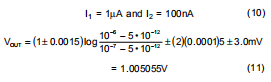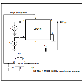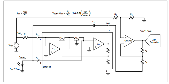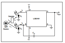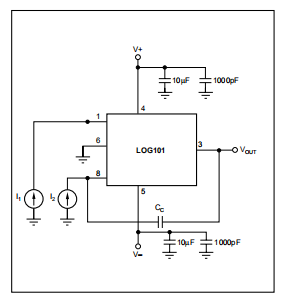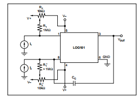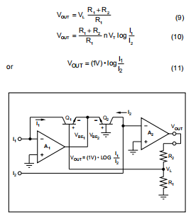 当LOG101用于计算对数时,I1或I2可以保持恒定,并成为与另一个进行比较。VOUT表示为:VOUT=(1V)•对数(I1/I2)(1)