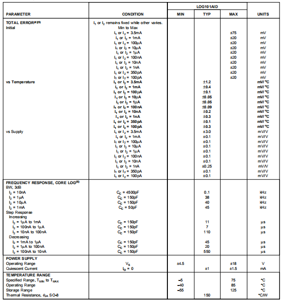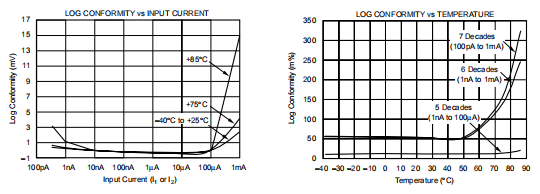 注:(1)对数一致性误差是指VOUT与对数(I1/I2)曲线最佳拟合直线的峰值偏差,用满标度峰间百分比表示。