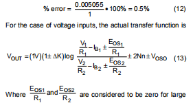 对数比放大器的精度考虑比其他放大器更复杂。这是因为传递函数是非线性的输入,每一个都可以在很大的动态范围内变化。确定任何输入组合的精度从总错误规范中。