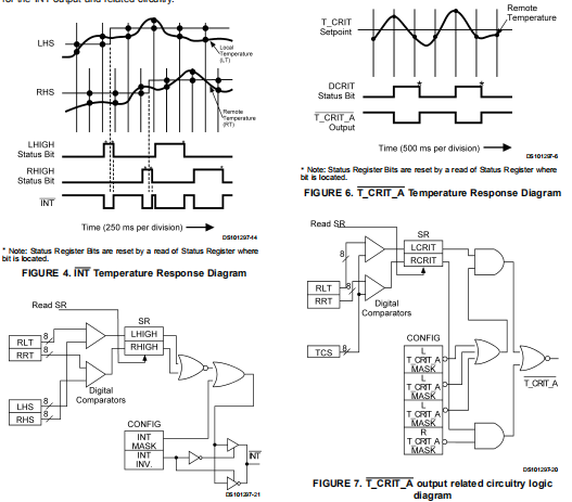 每个温度读数(LT和RT)与高设定点寄存器(LHS、RHS)。在温度结束时,通过数字比较确定该读数已超过设定值上限。如果温度读数大于设定值上限,则在状态寄存器中的一个,用来指示哪个温度读取,并激活INT输出。本地和远程温度二极管由A/D转换器按顺序采样。INT输出和状态寄存器标志在转换完成时更新,它发生在温度二极管后大约60毫秒是抽样的。当状态寄存器,包含设定位,则读取温度读数