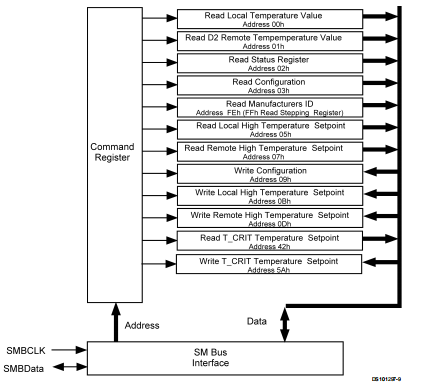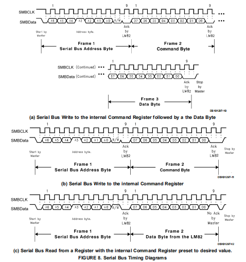1.如果锁定在命令寄存器中的位置是正确的(大多数情况下,命令寄存器将指向一个读取温度寄存器,因为这将是最频繁读取的数据从LM82),则读取可以简单地由地址字节,后跟检索数据字节。