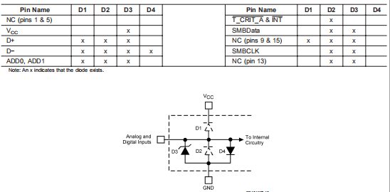 9.应保持D+和GND之间的泄漏电流至少。一毫安的泄漏会导致二极管温度读数误差高达1˚C。保持印刷电路板尽可能干净,将使泄漏电流降到最低。