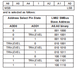 LM82作为SMBU上的从机操作,因此SMBCLK线是一个输入(LM82不生成时钟)而且SMBData线是双向的。据SMBus说规格,LM82有一个7位从机地址。位4(A3)从机地址在LM82内部硬连接到1。其余地址位由状态控制选择地址的引脚ADD1和ADD0,并由设置将这些引脚连接到接地(0),连接到VCC高(1)或左浮动(三电平)。因此,完整的从机地址为: