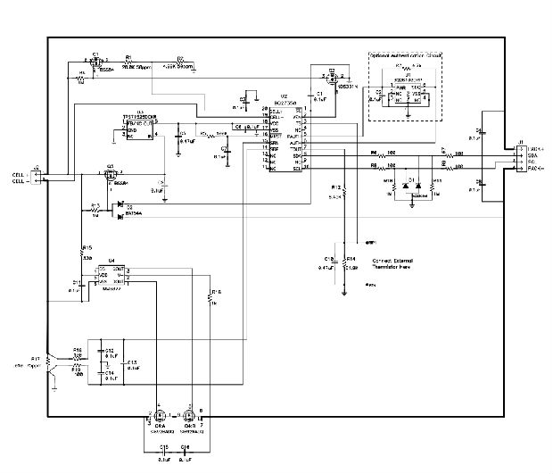 还显示了使用bq26100(U1)和外部温度测量(R12、R14和C10)进行外部认证的可选电路。