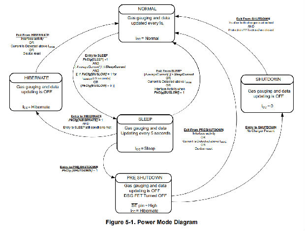 bq27350有四种电源模式:正常、休眠、休眠和关机(按功耗降序排列)。在正常模式下,bq27350是完全通电的,可以执行任何允许的任务。在休眠模式下,煤气表处于低功率状态,定期进行测量和计算。在休眠模式下,煤气表处于最低功率状态,只会被通信活动或电池电流的增加唤醒。最后,在关机模式下,关闭所有bq27350电路,并切断设备电源;通过向设备重新施加足够的电压,可以重新启动IC。