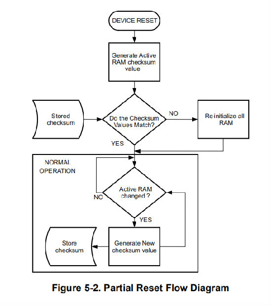 如图5-2所示,如果检测到部分重置,则生成RAM校验和并与先前存储的校验和进行比较。如果校验和值不匹配,RAM将被重新初始化(“完全复位”)。每次RAM改变时,存储的校验和都会更新。