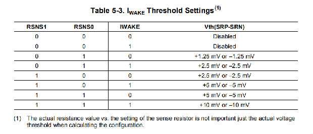 当bq27350处于休眠或休眠模式时,唤醒比较器用于指示单元电流的变化。PackConfiguration()使用位[RSNS1-RSNS0]来设置检测电阻器的选择。PackConfiguration()使用[IWAKE]位为给定的检测电阻器选择选择两个可能的电压阈值范围之一。当在充电或放电方向突破阈值时,会产生内部中断。RSNS1..0的0x00设置将禁用此功能。