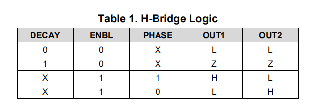 相位输入引脚控制流过H桥的电流方向,从而控制直流电机的旋转方向。ENBL输入引脚在高电平激活时启用H桥输出,也可用于电机的PWM速度控制。注意,当ENBL=0时,衰变管脚的状态选择桥接器的行为,允许选择慢衰减(制动)或快速衰减(滑行)。表1显示了逻辑。
