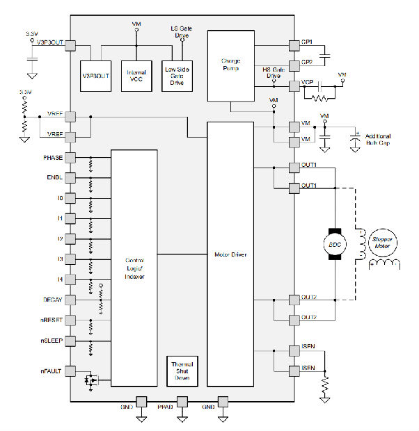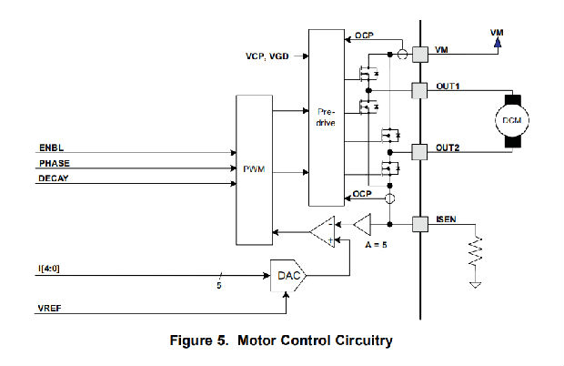 一个简单的PHASE/ENBL接口可以方便地连接到外部控制器。5位电流控制方案允许多达32个离散电流电平。电流调节方法在慢衰减和快衰减之间可调。