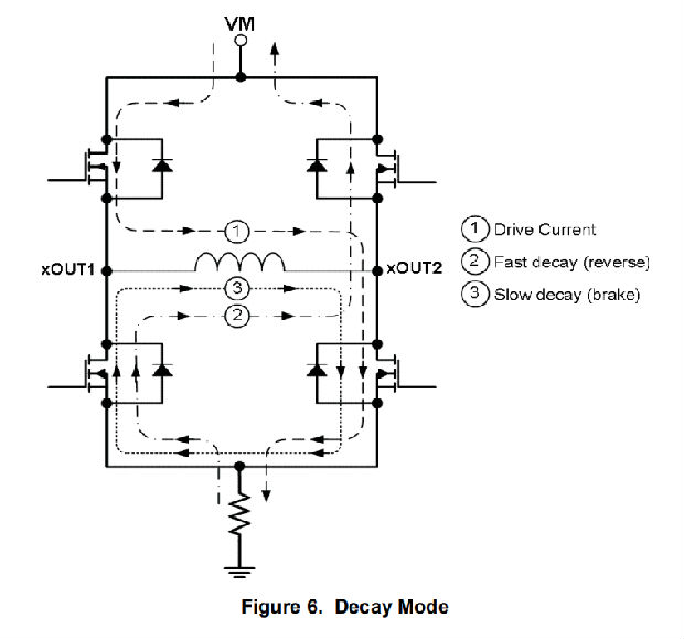 一旦达到斩波电流阈值,H桥可以在两种不同的状态下工作,快衰减或慢衰减。