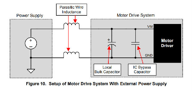 电源和电机驱动系统之间的电感会限制电源电流的变化率。如果局部大容量电容太小,系统将对过大的电流需求作出响应,或者随着电压的变化而从电机中卸载。当使用足够的大容量电容时,电机电压保持稳定,并能快速提供大电流。