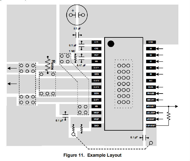 低ESR陶瓷电容器必须放置在VM和VCP引脚之间。TI建议16 V额定值为0.47μF。将该部件尽可能靠近销。此外,在VM和VCP之间放置1 MΩ。