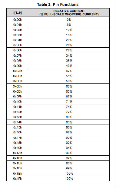 五个输入引脚(I0-I4)用于将电桥中的电流缩放为VREF输入引脚和感测电阻设置的满量程电流的百分比。I0-I4引脚的内部下拉电阻约为100 kΩ。销的功能如表2所示。