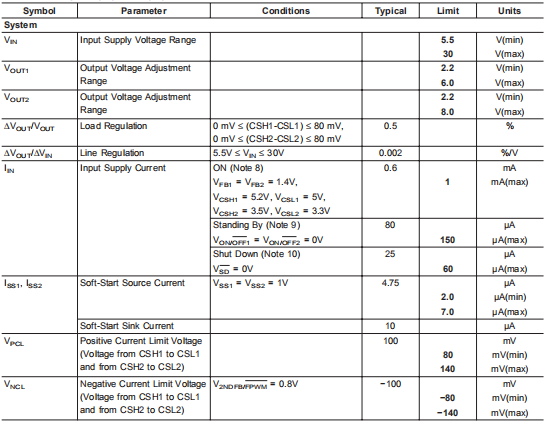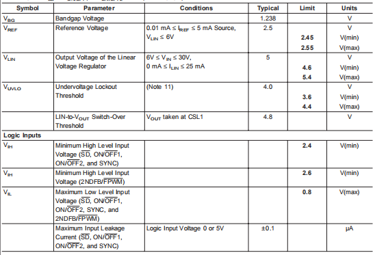 注9:两个开关控制器均关闭。5V,50 mA线性调节器(LIN输出)和精度2.5V参考(REF输出)保持开启。