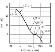 LM2641必须适当补偿以确保运行稳定,瞬态响应好。和任何人一样控制回路,当补偿得到优化,从而在保持足够的相位裕度的同时获得最大的带宽,从而获得最佳性能稳定性。LM2641的最佳性能通常在以下情况下获得:环路带宽(定义为环路增益等于单位)在FOSC/10到FOSC/5的范围内。在讨论回路稳定性时,应注意有一个高频极fp(HF),其频率可以近似值为:fp(HF)~FOSC/2 X QS(假设QS<0.5)