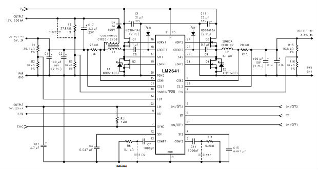 LM2641是双降压电源控制器适用于笔记本电脑和其他电池供电设备。逻辑电平N通道的定频同步驱动功率MOSFET与可选在1000:1负载电流范围内实现超高效功率转换的脉冲跳过模式。脉搏跳动模式可以禁用,有利于固定频率操作无论负载电流水平如何。高直流增益电流模式反馈控制保证出色的线路和负载调节和宽环路带宽快速响应动态负载。内部振荡器将开关频率固定在300千赫。或者,切换可以同步到外部时钟运行速度高达400千赫。可选软启动功能限制来自在启动时输入电源并提供一种简单的方法启动顺序。逻辑电平输入允许控制器打开和分别关闭。